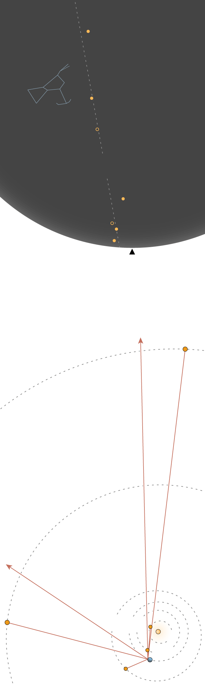 Whenever planets are visible in the night sky, they always appear roughly along the same line. This path, known as the ecliptic, is the same one that the sun travels along during the day.