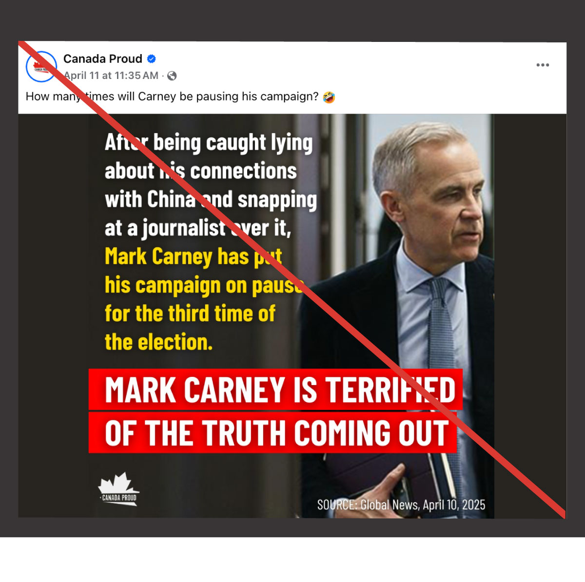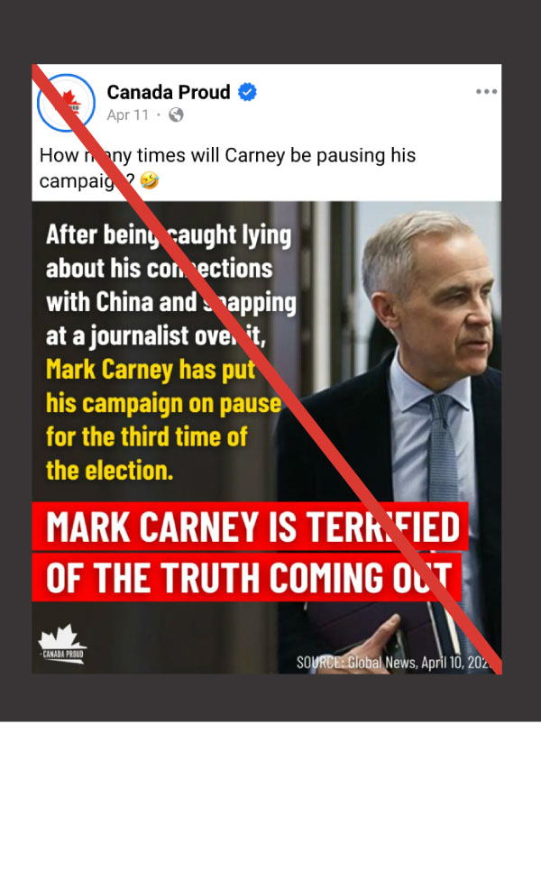 A Facebook post this month from Canada Proud cited a mainstream news report but added a false suggestion that Mr. Carney was suspending his campaign after a controversy over China.