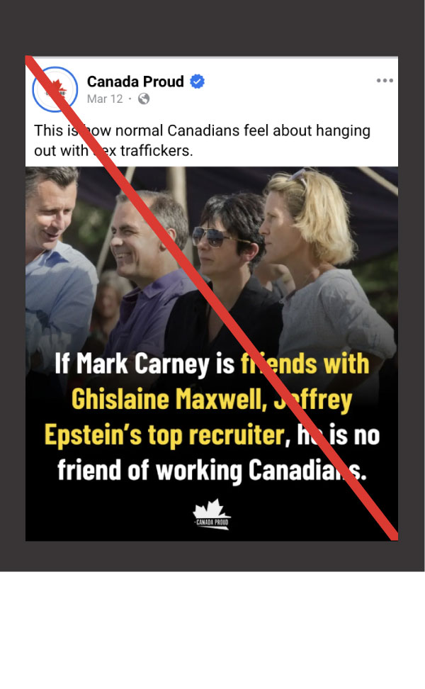 On Facebook, Canada Proud published some misleading posts about Prime Minister Mark Carney and Ghislaine Maxwell, the socialite and convicted sex trafficker.