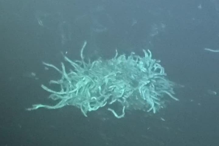 Now, only a single cluster of tube worms remained in the blackened terrain, all dead. A haze of particulates filled the water as glints of bright orange lava flickered among the rocks.